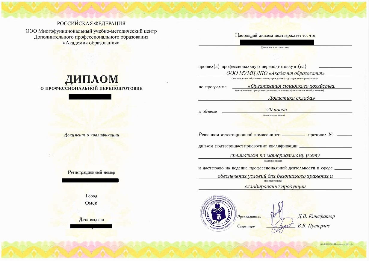 • «Специалист по материальному учету» с правом ведения профессиональной деятельности в сфере обеспечения условий для безопасного хранения и складирования продукции