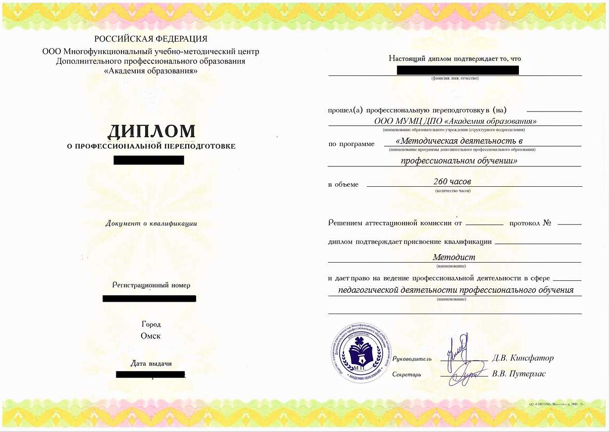 - Диплом о профессиональной переподготовке установленного государством образца. Срок действия: бессрочно